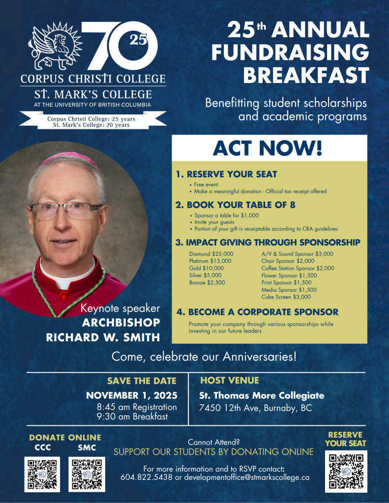 At the event, you’ll have the opportunity to hear from students, alumni, talented faculty, and dedicated staff as they share their stories about how the college has transformed them. This is also your opportunity to hear our new Chancellor in his first address for the College. For Archbishop Smith detail biography please follow the link: Biography – Archdiocese of Vancouver