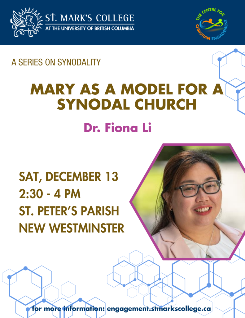 – December 13, 2025  2:30pm:  Mary as a Model for a Synodal Church, with Dr. Fiona Li.