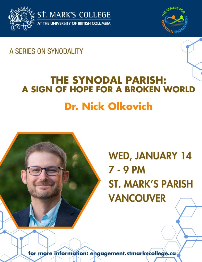 The Center for Christian Engagement at St. Mark’s College continues the Synodality lecture series with Dr. Nicholas Olkovich on January 14, 2026 7pm: The Synodal Parish:  A Sign of Hope for a Broken World, at St. Mark’s College.